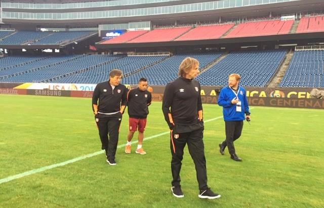 El director técnico Ricardo Gareca acompañado del profesor Alfredo Honores y el jugador Christian Cueva, reconocieron ayer el campo del estadio Gillette de Foxborough (Massachusetts). (Foto FPF).