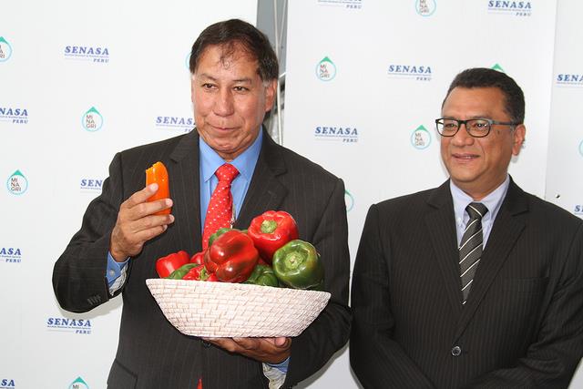 El subsecretario de Promoción y Programas Regulatorios de la Secretaría de Agricultura de Estados Unidos, Edward Avalos, muestra nuestro pimiento al lado del ministro de Agricultura y Riego, Juan Manuel Benites.