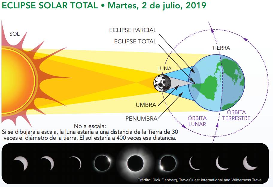 El Sol se ocultará tras la Luna mientras recorre una franja de 122 kilómetros sobre la Cordillera de los Andes, explica la NASA. Así, las penumbras iniciarán su “gobierno” sobre el Pacífico, cuando la sombra lunar ingrese a La Serena, Chile, a las 2:22 p.m. (hora de Lima). Aunque el eclipse total solar estará en su máxima dimensión en la misma zona a las 3:38 p.m. y finalizará en Chascomús, Buenos Aires, Argentina a las 3:44 p.m.