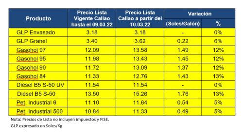 2. Debido a la coyuntura actual, se incrementaron a partir de hoy, los precios de nuestros combustibles (gasolinas, diésel, residuales, entre otros). Con relación al GLP envasado y diésel de uso vehicular, el precio de lista vigente se mantiene, dado que se encuentran comprendidos en el Fondo de Estabilización de Precios de Combustibles.