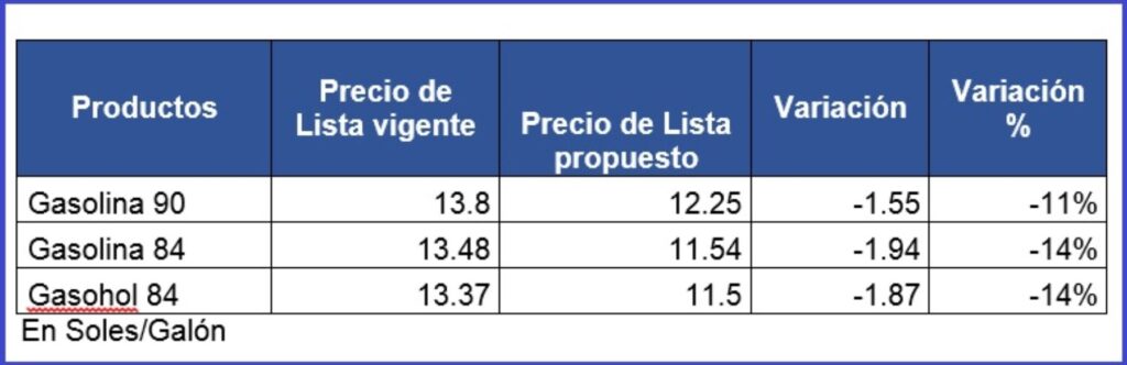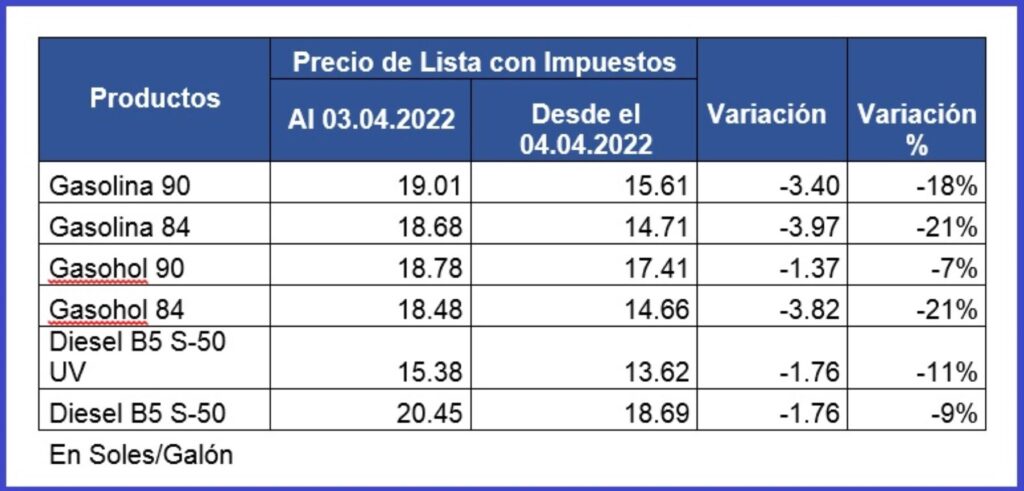 En ese sentido, precisó que en aplicación del Decreto Supremo N° 002-2022-EM publicado en el Diario Oficial El Peruano el 29 de marzo de 2022, que incluyó a la Gasolina/Gasohol 84, Gasolina 90, Diésel 2 UV y Diésel 2 S-50 UV en el Fondo de Estabilización, se implementaron las siguientes reducciones de precios de lista vigentes a partir de hoy (4 de abril de 2022).