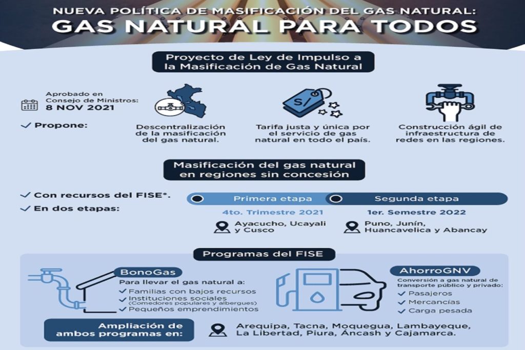 Para llevar el gas natural a familias de escasos recursos, en los próximos días se ampliarán los programas de gas natural del FISE (BonoGas y Ahorro GNV) y la construcción de redes de distribución en Arequipa, Tacna, Moquegua, Lambayeque, La Libertad, Piura, Áncash y Cajamarca.