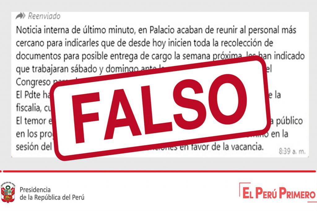 Dicha información falsa está referida a supuestos comunicados sobre la situación generada por la segunda moción de vacancia presidencial presentada por un sector del Congreso y que se discutirá este lunes 9 de noviembre.