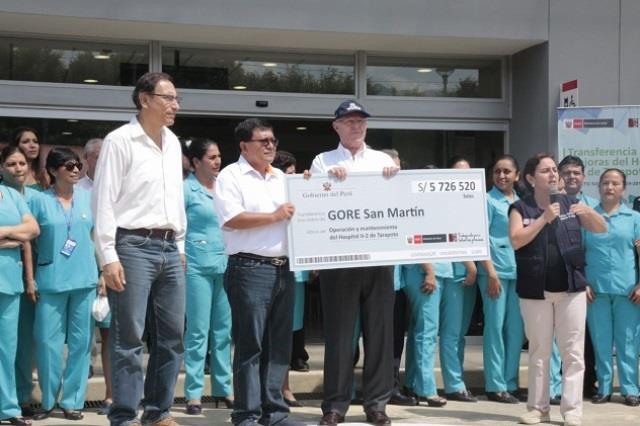Tras realizar una inspección a las modernas instalaciones del nosocomio, el Jefe de Estado acompañado de la ministra de Salud, Patricia García, entregaron en un cheque simbólico el monto total de la transferencia al gobernador regional de San Martín, Víctor Manuel Noriega Reátegui.