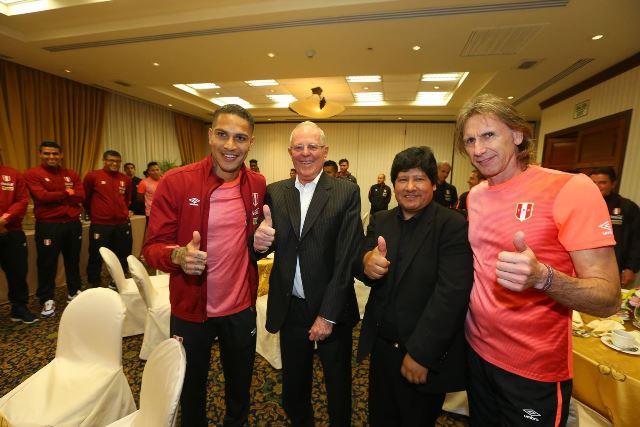 El presidente Kuczynski dialogó por muy corto tiempo pero con alegría, con algunos jugadores como Paolo Guerrero y el entrenador a quienes llevó su mensaje de positivismo.