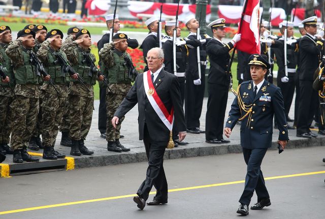 Durante su caminata el mandatario pasó revista a las tropas ubicadas en el perímetro de la Plaza Mayor de Lima, acompañado en el recorrido por el jefe de la Casa Militar, General FAP Carlos Elera.