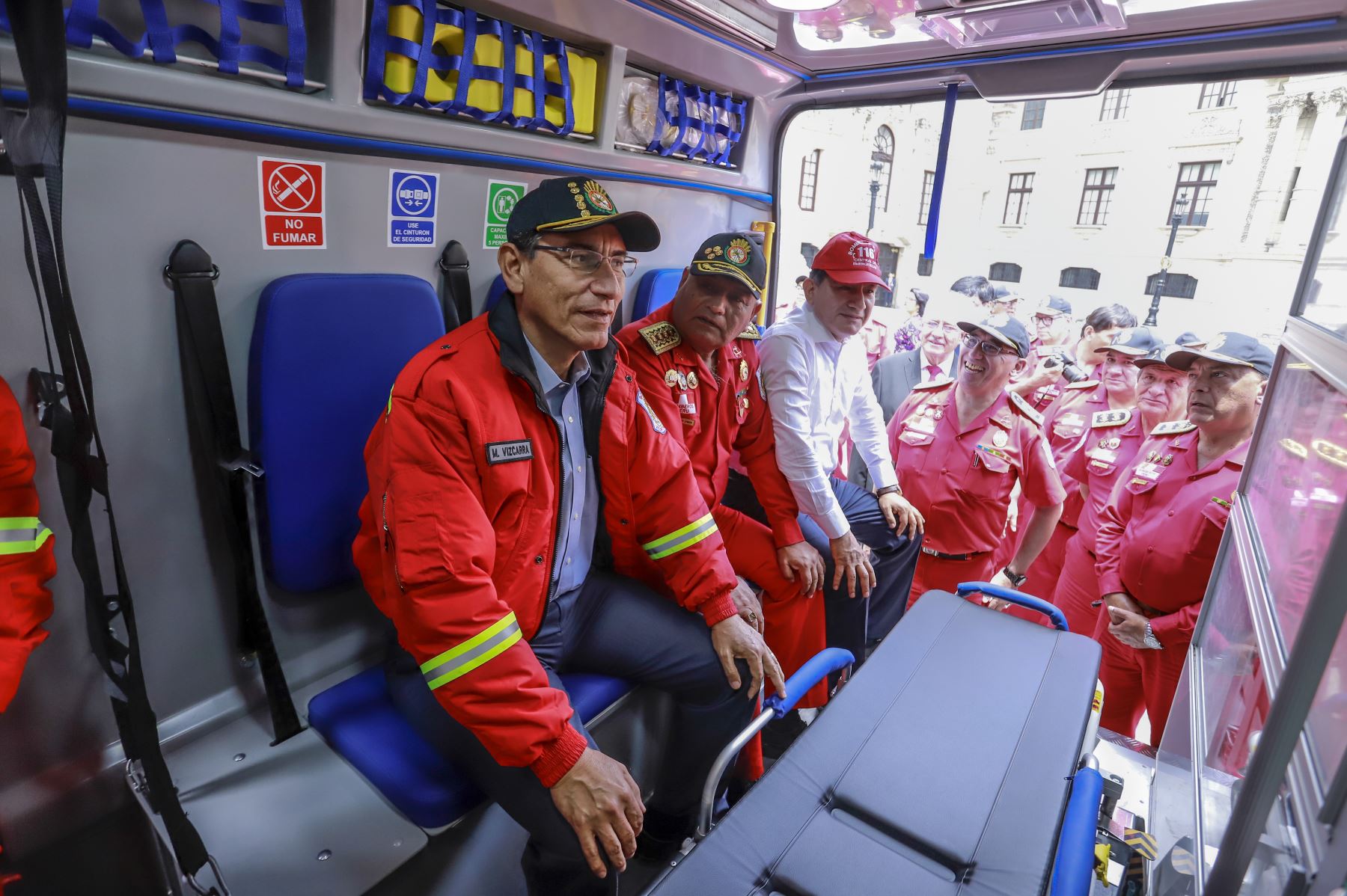 El presidente Martín Vizcarra encabezó hoy la ceremonia de entrega de 21 vehículos y herramientas de rescate que reforzarán la labor cumplida por el Cuerpo General de Bomberos Voluntarios del Perú.