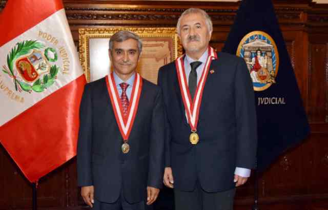 El presidente electo del Poder Judicial, Duberlí Rodríguez Tineo, y el actual titular de ese poder del Estado, Ramiro de Valdivia Cano, que culmina sus funciones el 31 de diciembre de este año.