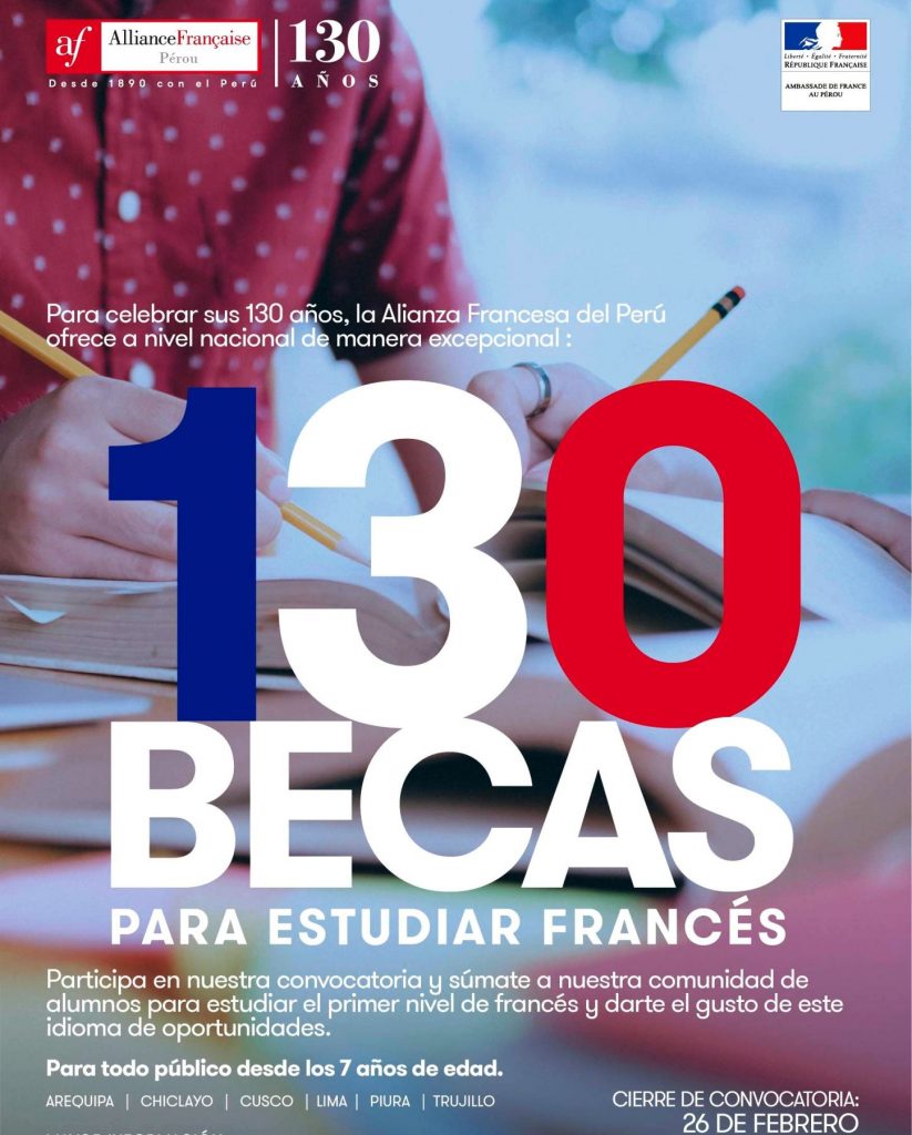 La red de Alianzas Francesas en el Perú da acceso a 130 becas de estudio del idioma francés, a fin de brindar a jóvenes y adultos nuevas oportunidades de estudios de idioma francés.