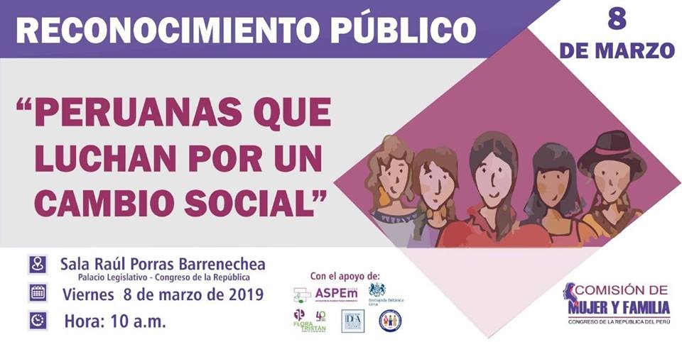 En el marco del “Día Internacional de la Mujer”, este viernes #8DeMarzo a las 10:00 a.m. en la Sala Raúl Porras Barrenechea – Palacio Legislativo, reconoceremos la lucha y el trabajo que vienen realizando las mujeres peruanas, desde diferentes categorías y espacios de acción, en la defensa de sus derechos laborales y económicos, la revalorización del arte y la cultura, la defensa y búsqueda de la justicia, entre otras.