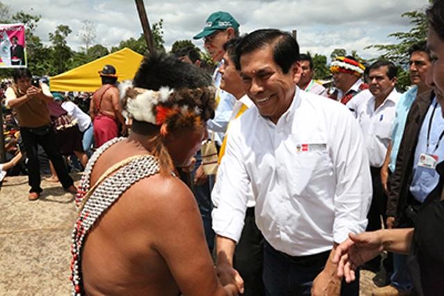 : El ministro José Manuel Hernández es saludado por un pequeño agricultor amazónico, por dar inicio a este proyecto que tenía 50 años de retraso.