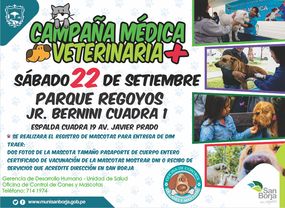 La Municipalidad de San Borja los invita este sábado 22 de setiembre, a una nueva campaña médica veterinaria, esta vez en el Parque Regoyos.