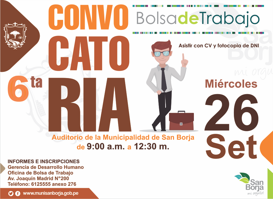 La Municipalidad de San Borja invita a la próxima convocatoria de la Bolsa de Trabajo.