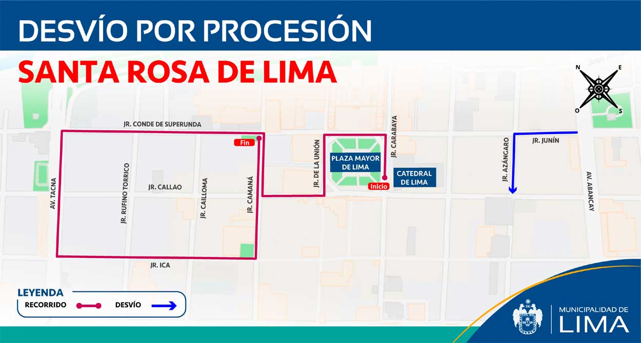 La Municipalidad de Lima informó que ejecutará un plan de desvíos en algunas calles del Centro Histórico debido a la procesión de Santa Rosa de Lima. La medida aplicará este jueves 29 y viernes 30 de agosto.