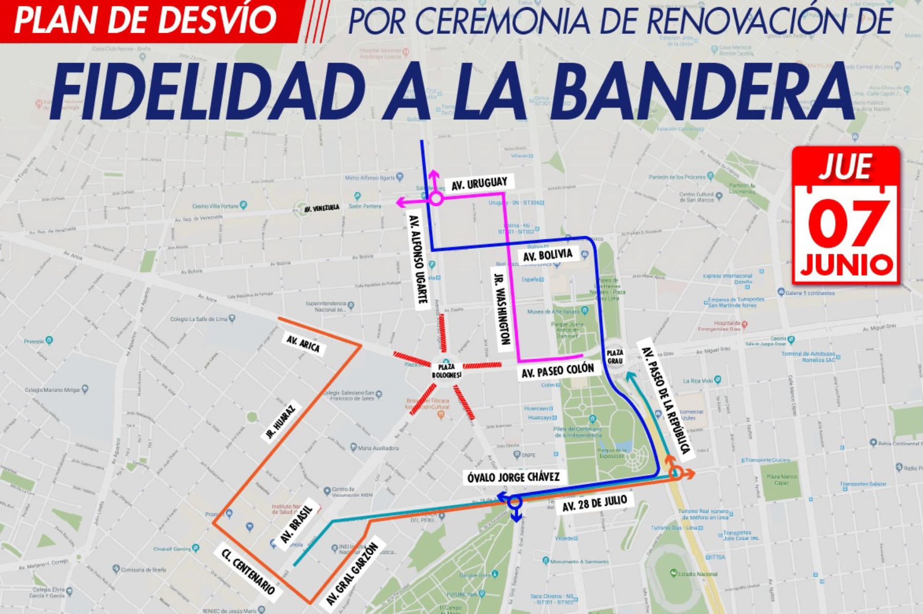 Con motivo de la ceremonia de renovación de fidelidad a la Bandera que se desarrollará mañana en la Plaza Bolognesi. se aplicará un plan de desvío vehicular en calles aledañas.
