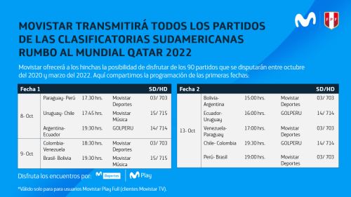 Canales: América TVLatina (canal 2), Movistar Deportes (canales 3 y 703)