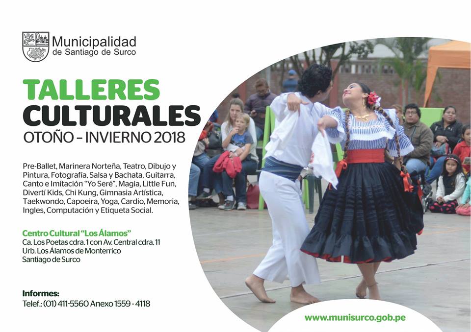 El arte y el conocimiento son para todos en Santiago de Surco. Es por eso que el Centro Cultural de “Los Álamos”, te invita a participar de los Talleres Culturales de Otoño – Invierno 2018, para niños, desde los tres años hasta personas de la tercera edad.