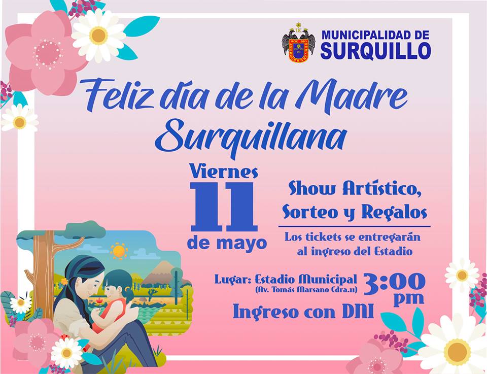 La Municipalidad de Surquillo invita a todas las mamis del distrito a pasar un celebración por su día.