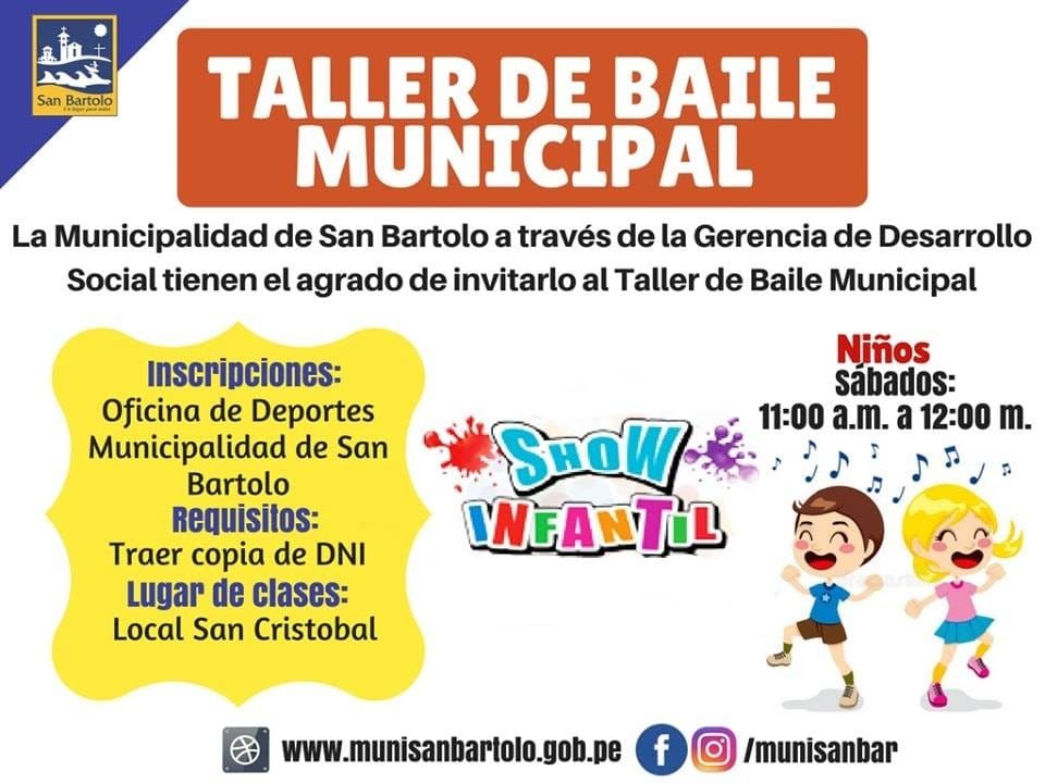 La Municipalidad de San Bartolo a través de la Gerencia de Desarrollo Social tienen el agrado de invitarlo al taller de Baile Municipalidad para niños.
