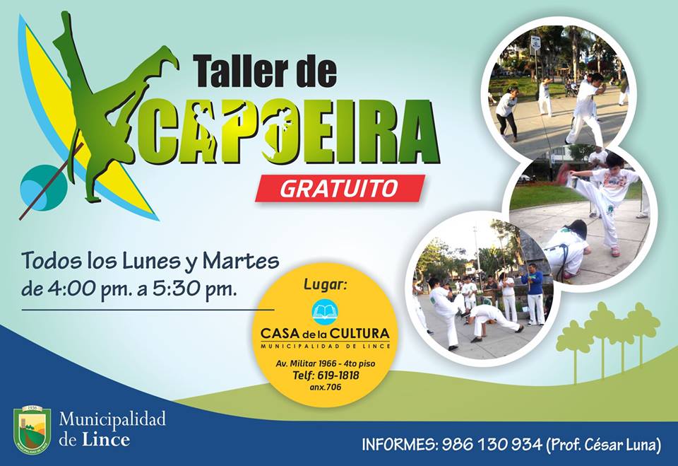 Si vives en Lince la municipalidad de tu distrito te invita a participar del TALLER DE CAPOEIRA GRATUITO.