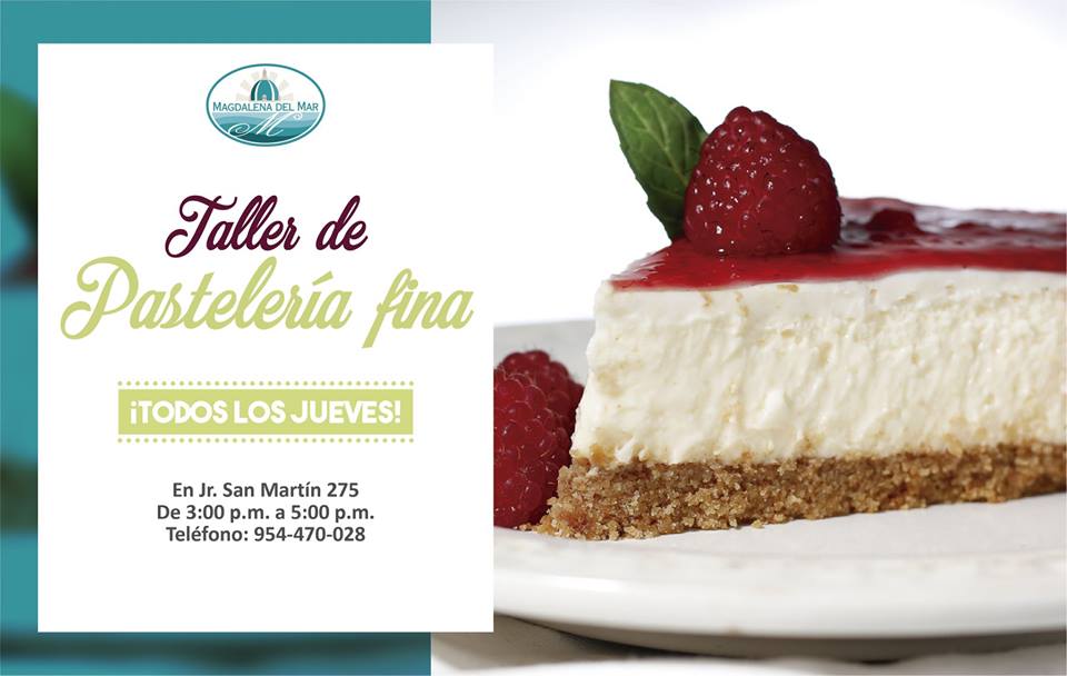 Como todos los jueves, esta semana se realizará un nuevo taller de pastelería fina en Magdalena del Mar, de 3:00 a 5:00 de la tarde, en jirón San Martín 275.