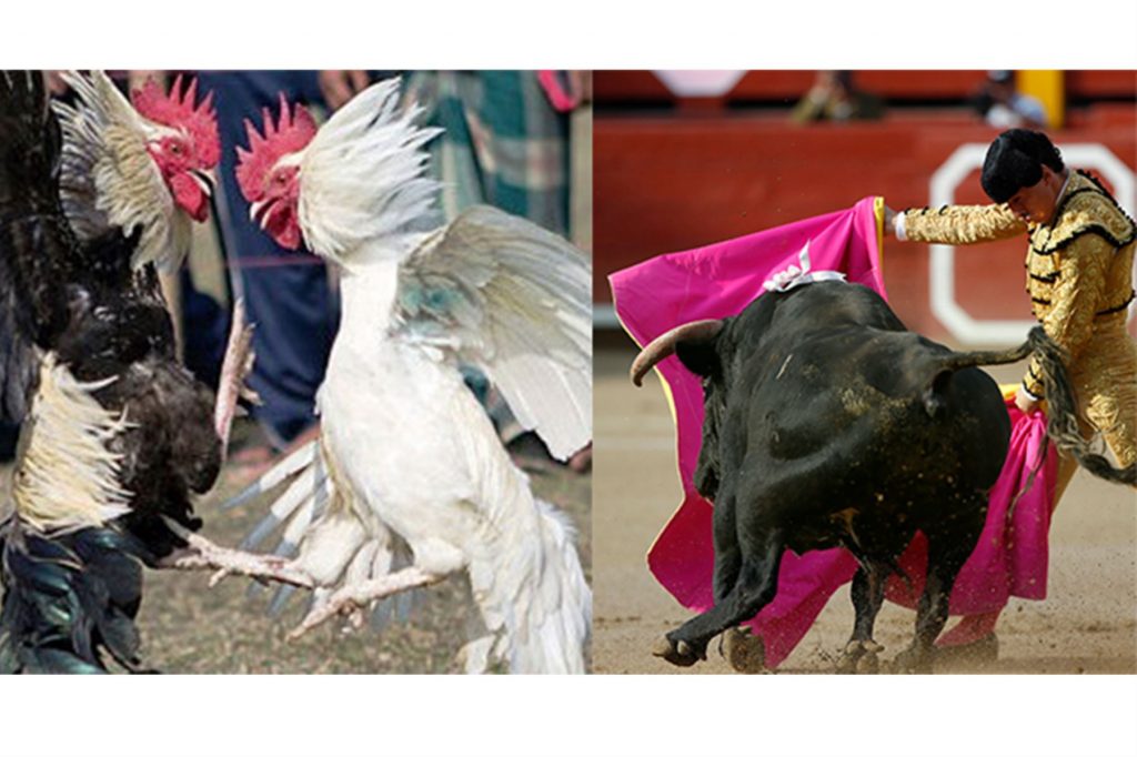 Las corridas de toros culminan con la muerte del animal, lo mismo que las peleas de gallos. En estas a veces mueren los dos combatientes. Estas dos actividades son legales en algunos países de América Latina, pero en otros han sido proscritas.
