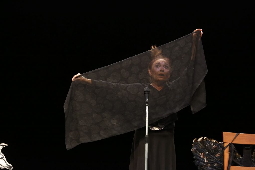 Una mujer vestida de negro, con pañuelo en la cabeza y anteojos ahumados, pasea inquieta y pensativa por el escenario del Gran Teatro Nacional. Es Rebeca exponiendo su cuerpo como soporte de información, proyectando la imagen de una viuda.