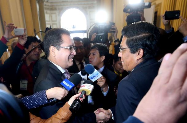 Con un apretón de manos Luis Iberico Núñez y Vicente Zeballos Salinas se desean suerte para las elecciones de mañana domingo. (Foto ANDINA).